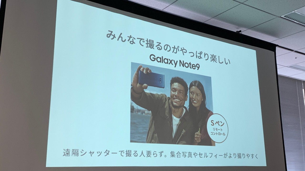 Sペンは筆圧検知4096段階、ペン先0.7mm、スキャン頻度360HzでGalaxy Note8と同様ながら新たにBluetooth LEによるワイヤレスリモコン機能に対応し、カメラのシャッターやYouTubeおよび音楽の再生・停止、プレゼンテーションにおけるスライドの操作などが行えるようになっているとのこと。リモコンはGalaxy Note9に40秒収納するだけで30分間利用可能。
