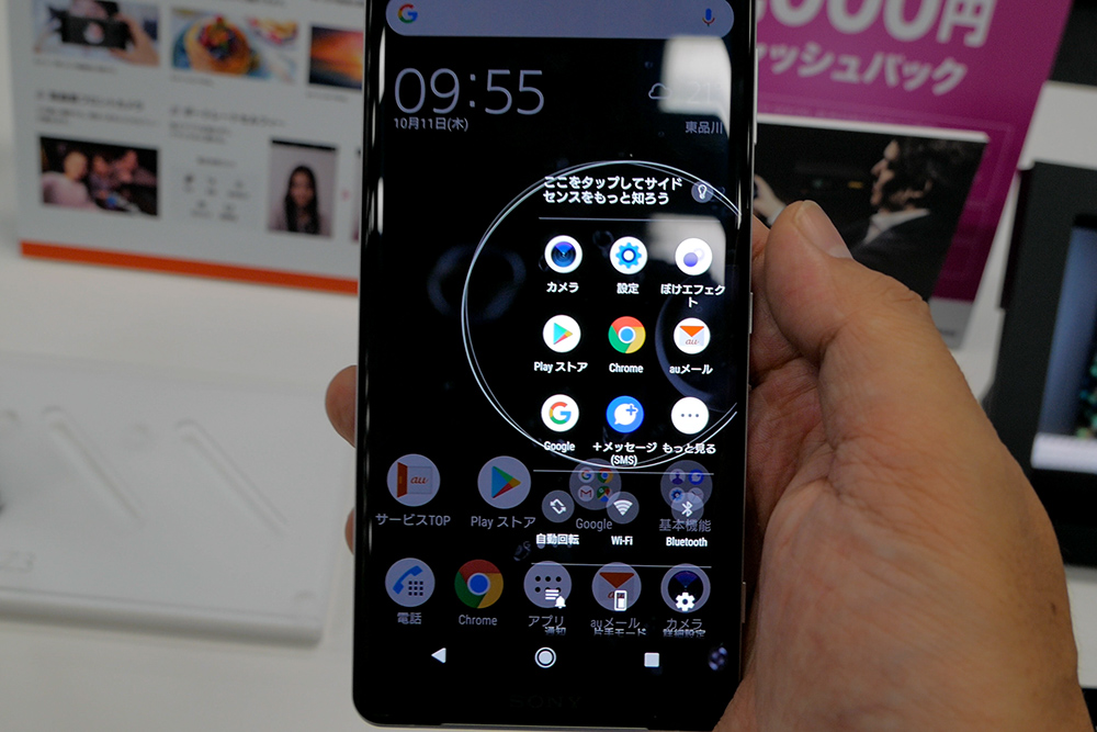 このエッジ部分はダブルタップすることでショートカットメニューが表示される「サイドセンス」として機能する。アプリ一覧には、よく使うアプリや次に使うだろうアプリをAIで学習しながら表示する。