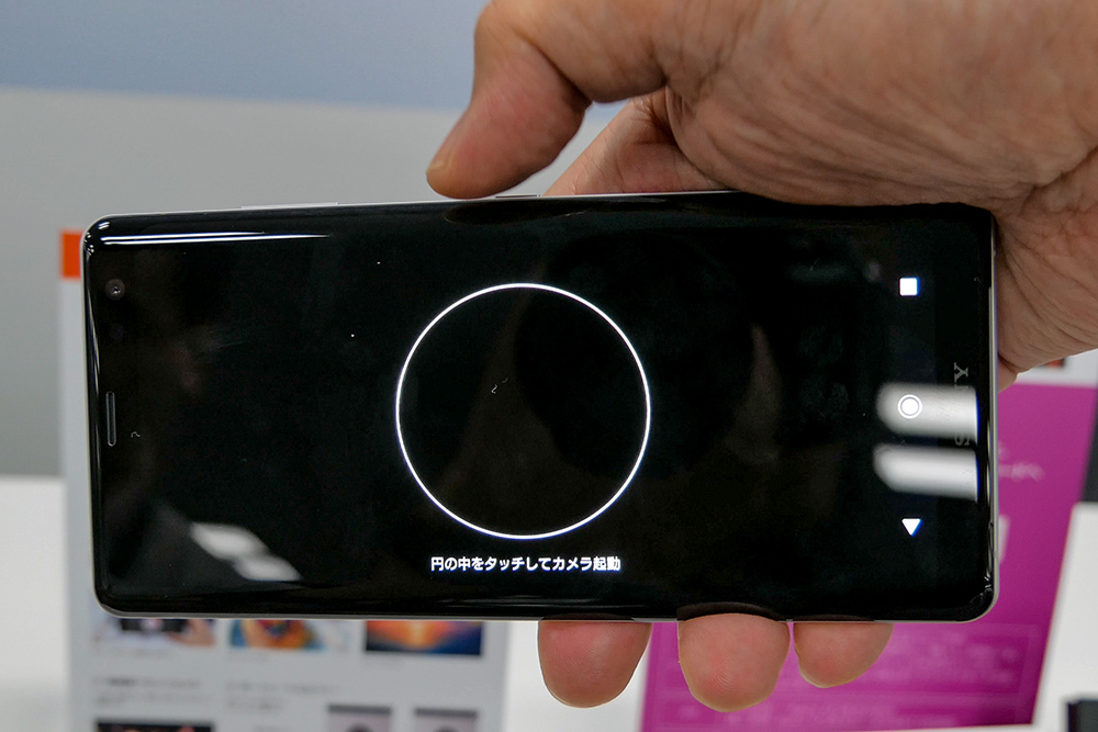 ロック画面から写真のように横向きに構えると、自動でカメラが起動する「スマートカメラ起動」を搭載。誤作動しないよう、円の中をタップしないとカメラにならないようになっている。通常はタップしてカメラ起動となるが、設定でタップ後1枚撮影にも変更可能である。