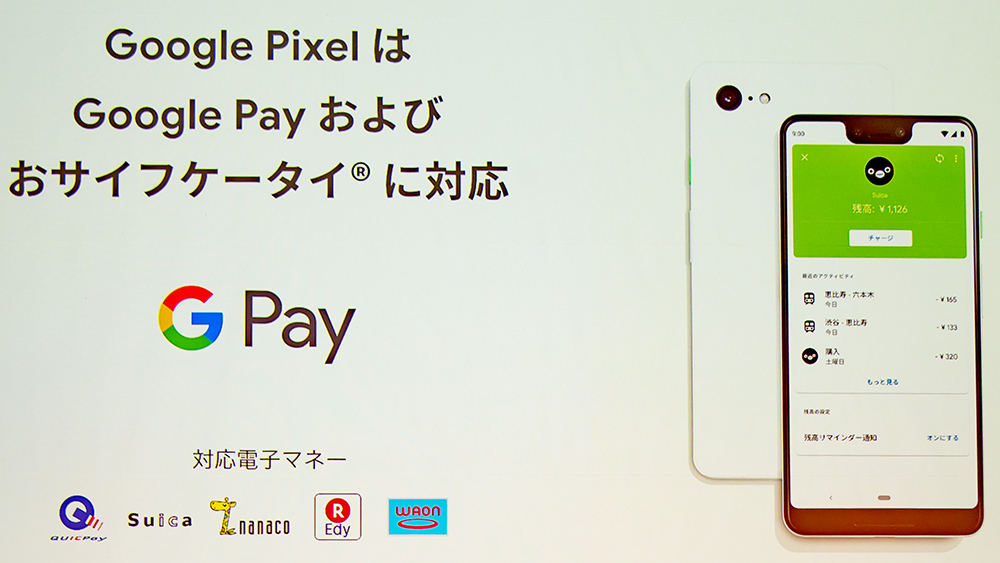最後に日本向けの機能として「おサイフケータイ(FeliCa)」にも対応することが説明された。日本向けのPixel 3およびPixel 3 XLには「おサイフケータイ」アプリがプリインストールされているので、Suicaや楽天Edyなどを登録、もしくは移行して利用可能だ。また、Googleの電子決済サービス「Google Pay」にも対応する。
