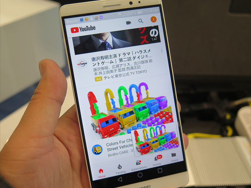 展示機のスマホで実際にYouTubeを再生させてみたところ、通常画質程度であれば動画の読み込みも非常にスムーズに行い視聴することができました。デモンストレーション機での実測で通信速度は5Mbps前後が出ているということです。