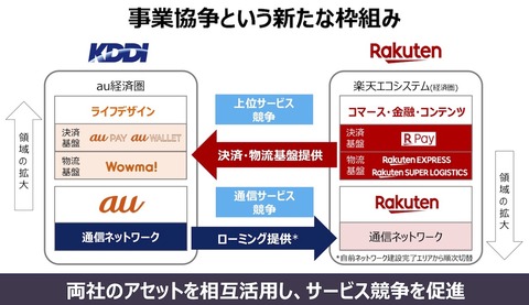 KDDIおよび沖縄セルラー電話と楽天は1日、決済および物流、通信ネットワーク分野において各社の保有するさまざまなアセットを相互利用し、それぞれの事業領域におけるサービス競争力を一層強化することで利便性向上を推進していくことに合意したと発表しています。