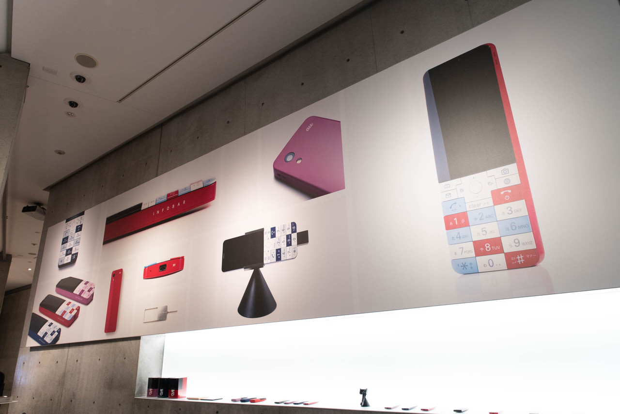 まずエントランスには「INFOBAR」シリーズのデザインを担当した深澤直人氏のコラムが掲示されている。後に紹介されているINFOBARのコンセプトモックは、今のスマートフォン(スマホ)のような使い方をイメージしたものになっており、コラム内でも深澤氏が15年以上前に将来的にフィーチャーフォン(従来型携帯電話、いわゆる「ガラケー」)からスマホへの進化を予想していたとのこと。