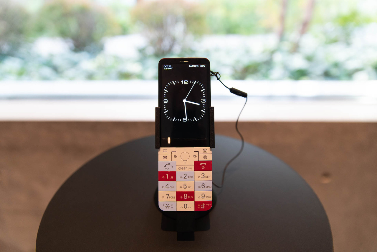 また展示されているINFOBAR xvは製品に同梱される卓上ホルダーに取り付けられた状態になっており、横向きでの卓上時計としての使い勝手も確認できる。