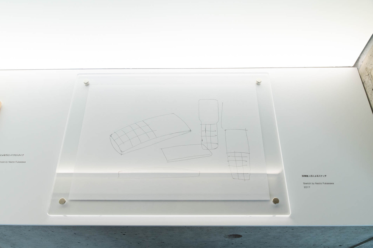 さらに進むと、そこには2017年にINFOBAR xvの企画が出て初めに深澤氏が描いたデザインスケッチから製品が完成するまでに作成されたモックアップを見ることができる。