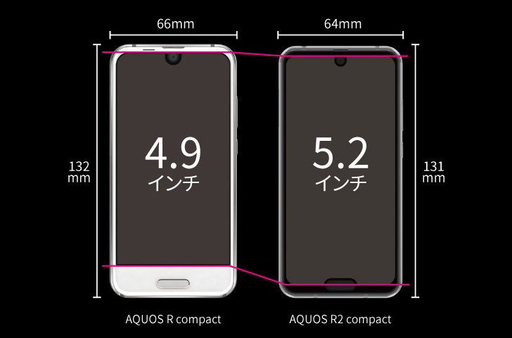 また、AQUOS R compactは画面のアスペクト比が9:17と若干縦長だった約4.9インチFHD+(1080×2032ドット)ハイスピード液晶だったのに対し、AQUOS R2 compactではより縦長になって主流のアスペクト比9:18の約5.2インチFHD+(1080×2280ドット)ハイスピード液晶に大画面化しています。