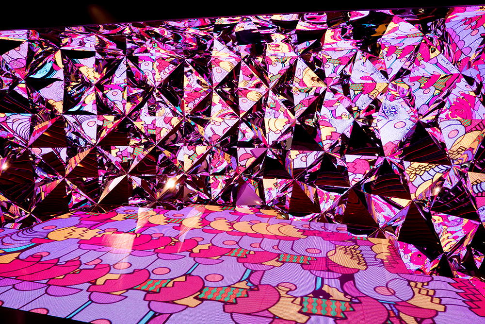 施設内の奥にある大きな体験ブースが今回の目玉となる壁面のミラーと床のLEDディスプレイによる「Galaxy Kaleidoscope」。万華鏡のような不思議な模様をバックにGalaxy Note9のリアカメラを使った静止画と動画撮影体験ができる。