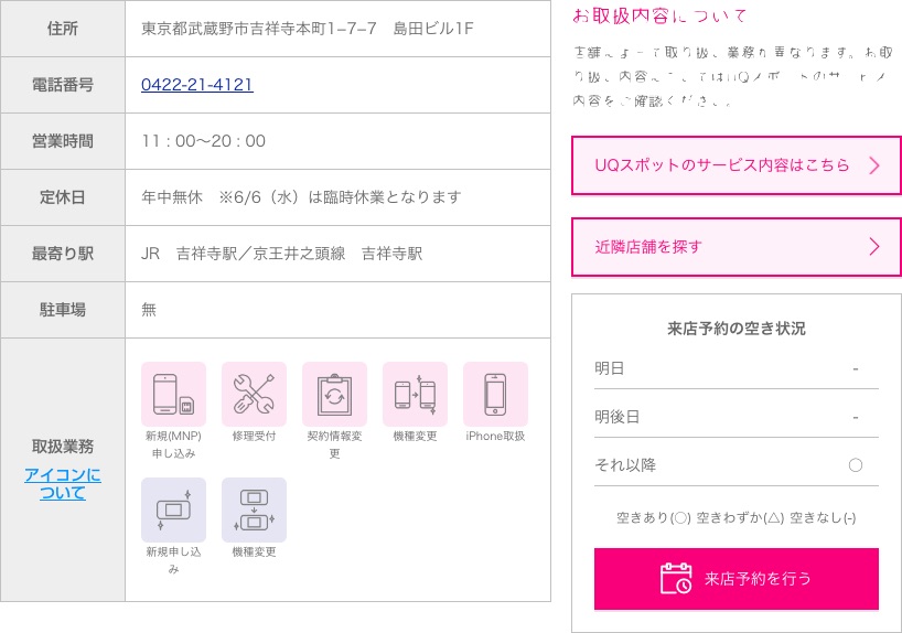 予約はUQ公式Webサイト内にあるUQスポットの各店舗ページにて「来店予約を行う」ボタンから来店予約状況を確認し、来店目的(新規契約・MNP・機種変更・契約内容変更・顧客情報変更・割引サービス申込み/変更・その他)や来店者情報を入寮して2週間後まで予約できるようになっています。