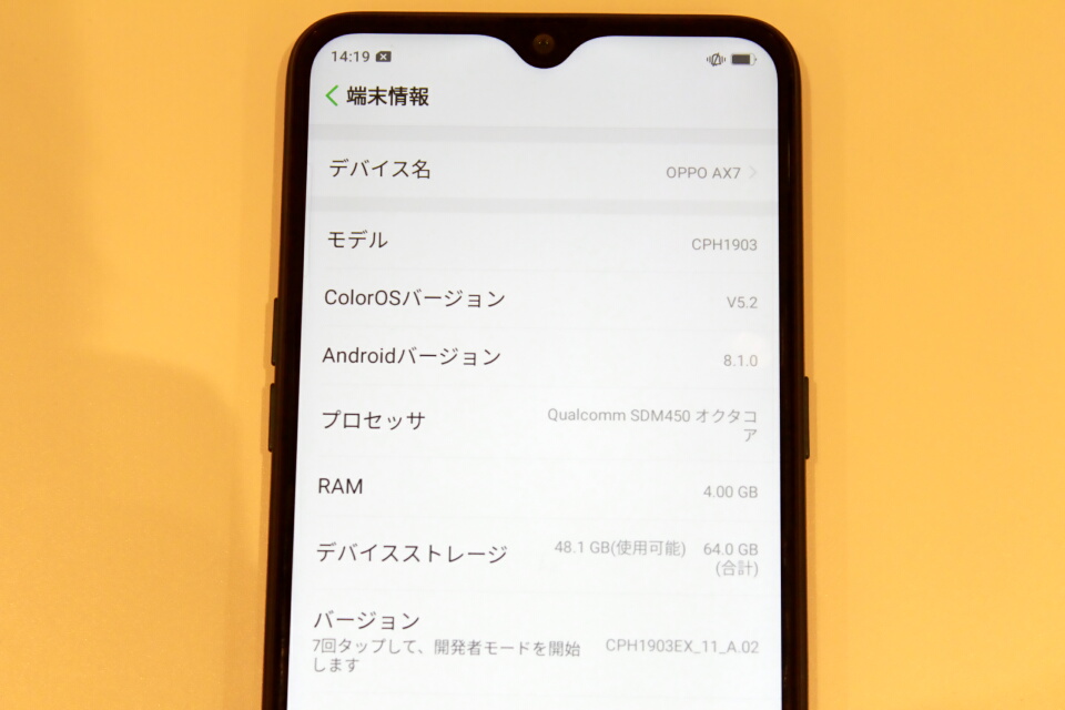 OPPO AX7のキャッチコピーは「みんなが使いやすいスマホ 大画面、高機能カメラ、大容量バッテリー、搭載」となっており、約6.2インチの大画面、約1300万画像+約200万画素のリアカメラおよび約1600万画素のフロントカメラ、約4230mAhの大容量バッテリーを搭載している点が主な特徴だ。