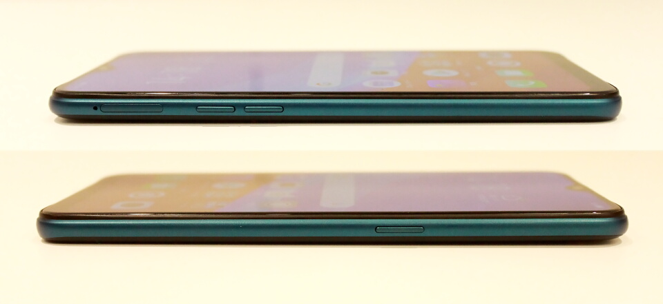 ディスプレイ面は、水滴型ノッチ(切り抜き)デザインを採用し、約6.2インチHD+(720×1520ドット)TFT液晶の大画面を実現している。スクリーン比率は9:19、画面占有率は88.4%と、流行の大画面縦長ディスプレイ仕様だ。