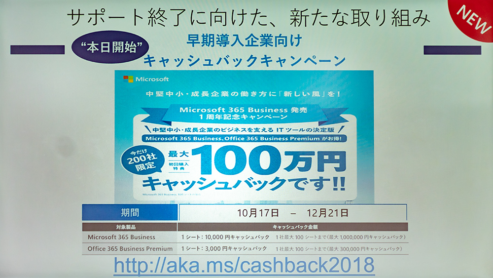 今回、新たな施策として2018年12月21日(金)までに「Microsoft 365 Business」もしくは「Office 365 Business Premium」の購入した企業先着200社に最大100万円をキャッシュバックするキャンペーンを実施している。