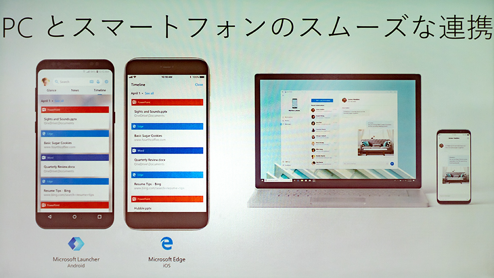 またMicrosoft 365のメリットとしてPCとスマホのスムーズな連携が特徴の1つである。Androidではホームアプリを同社が提供する「Microsoft Launcher」にすることでスケジュールやPCで開いたオフィスファイルなどの連携がホーム画面のスワイプで完結する。iPhoneをはじめとするiOS搭載製品でもWebブラウザーアプリ「Microsoft Edge」でPCのMicrosoft Edgeと連携可能だ。