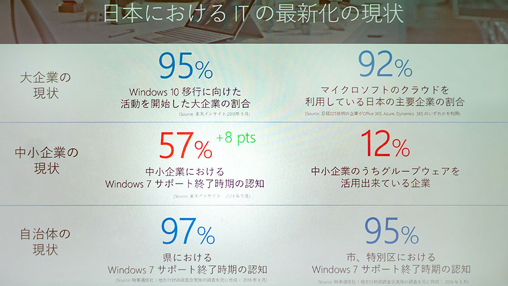 まず説明された日本におけるITの最新化の現状についてだが、大企業ほどWindows 10移行に向けた活動を行っているが、中小企業はWindows 7サポート終了時期の認知が57%とまだまだ低い。