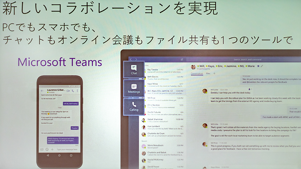 チャットやオンライン会議など使い勝手の良いグループチャットウェアの「Microsoft Teams」はPCだけではなくスマホでも利用可能で、ファイルの共有もOSの垣根を越えて簡単に可能である。