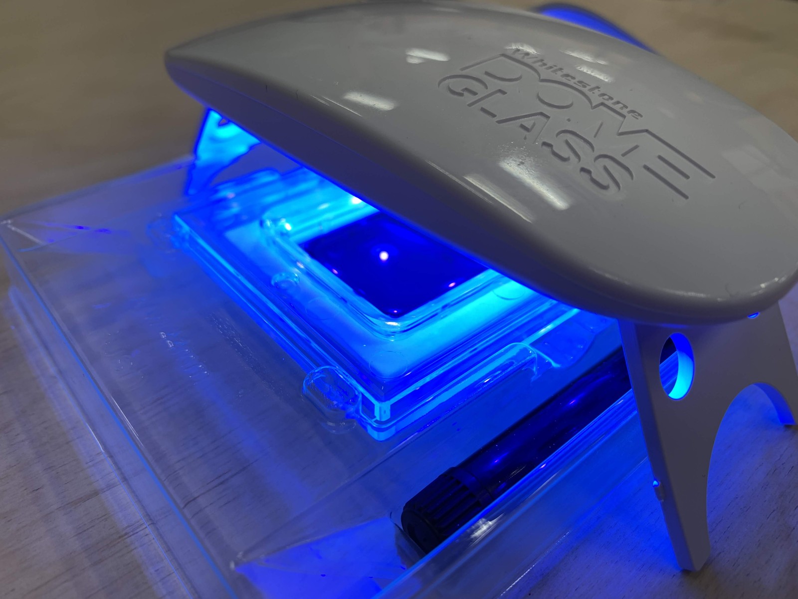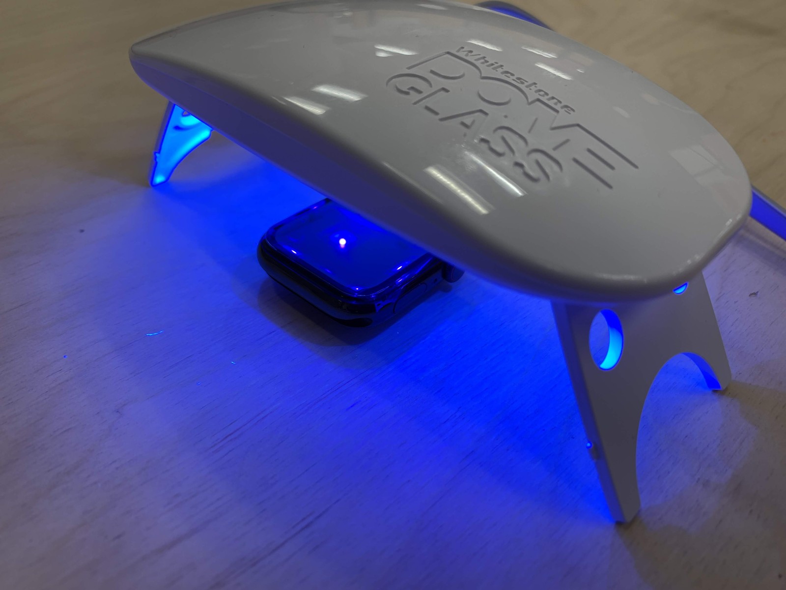 接着剤を流し込み、保護ガラスを置いたら接着剤を硬化させるために紫外線照射器をホルダーに固定して紫外線を照射します。
