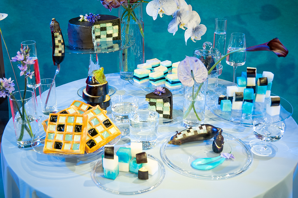 続いて「食」の作品作りを行ったCRAZY KITCHENは、NASUKONの色をイメージしたナスで作ったINFOBARや小茄子で作ったイヤリングなどの小物など、NASUKONの奥行が広がる作品作りしていると話す。タイル模様のケーキなどは全て食べられるもので作られている。