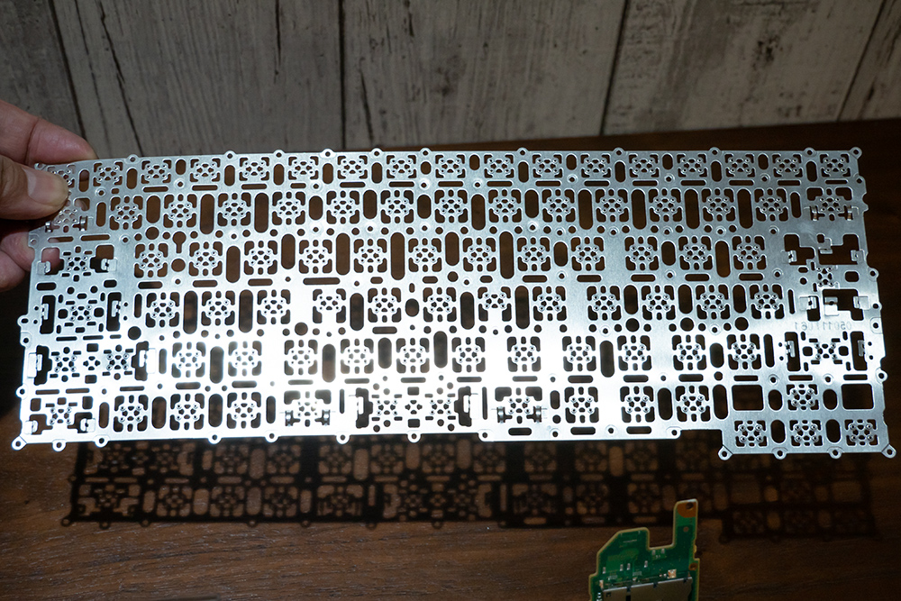 キーボードの下には極限まで肉抜きをし、軽量化と剛性をギリギリ保つプレートが入っている。この肉抜きのパターンはアート作品のようで面白い。