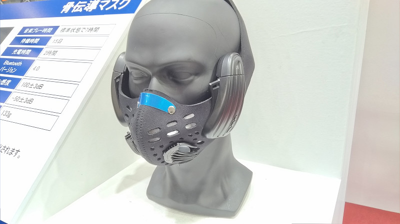 もう1つ、おまけとしてAnt matrixのブースに強烈なアイテムがあったので紹介します。それはKN95クラスの本格的な防塵マスクにBluetoothヘッドセットの機能を骨伝導スピーカーで持たせたもの。