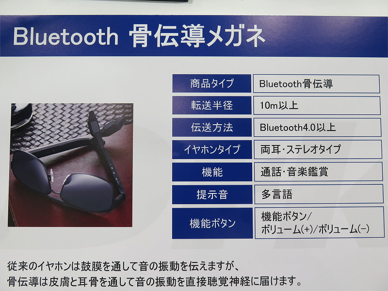 メガネのフレーム部にBluetooth接続の通話・オーディオ対応のステレオヘッドセットの機能を持たせたアイテムで、「骨伝導による音声出力で耳を塞ぐことなく、自然な装用感で利用ができる」ことが長所となっています。