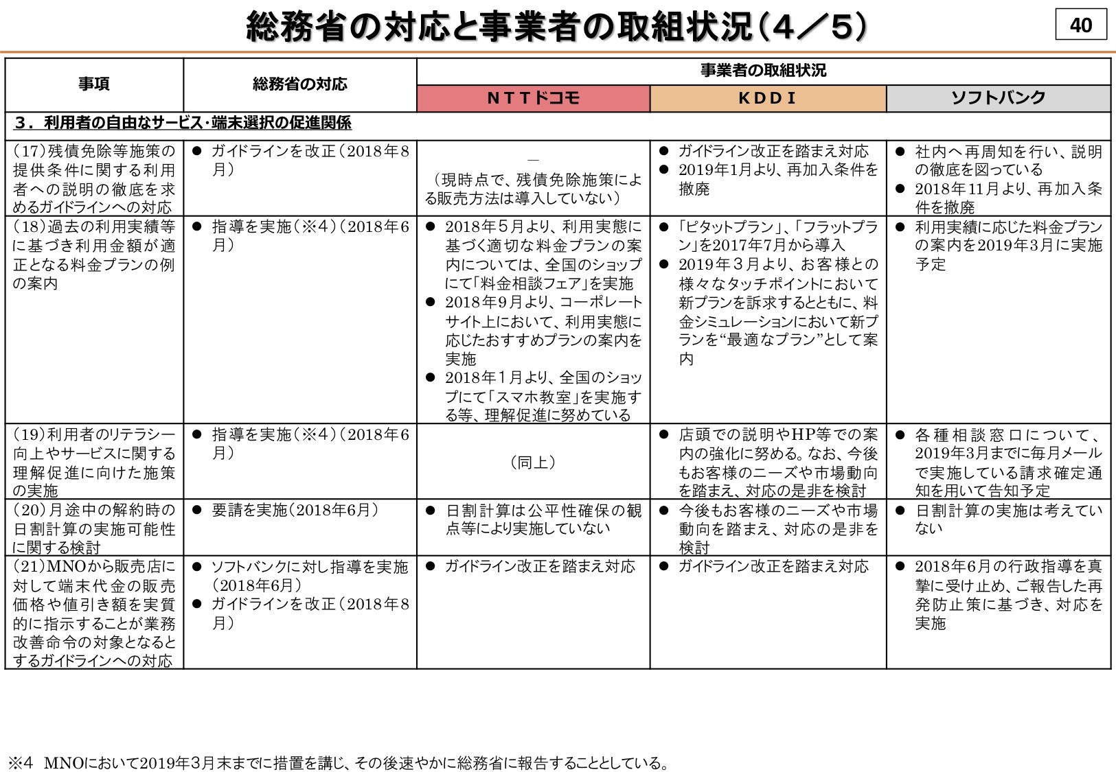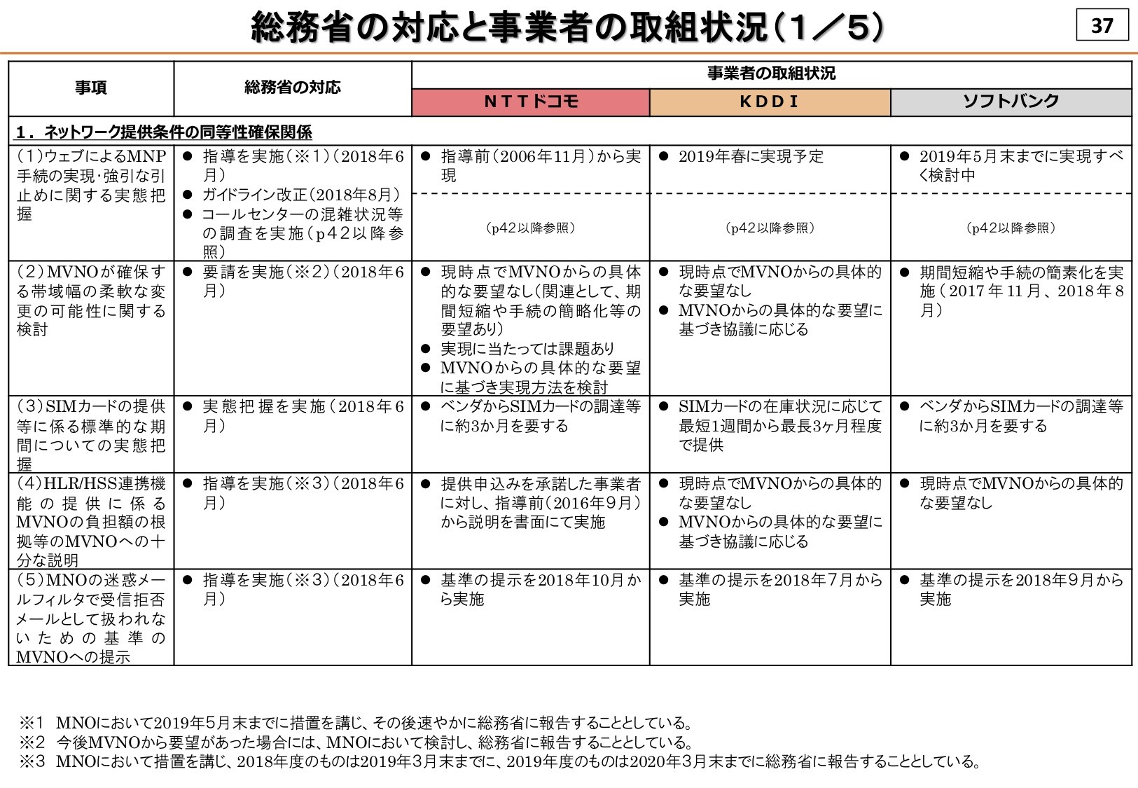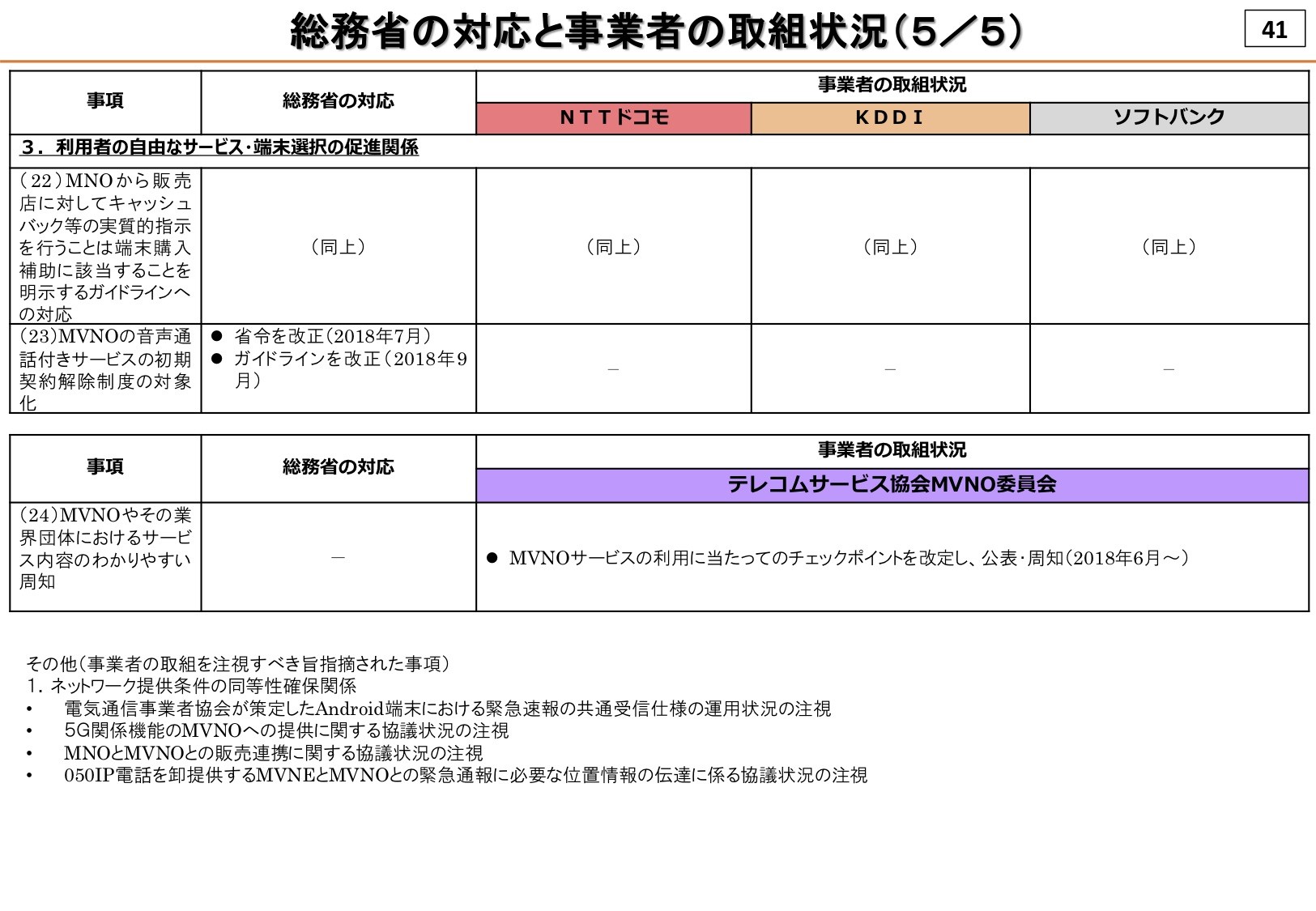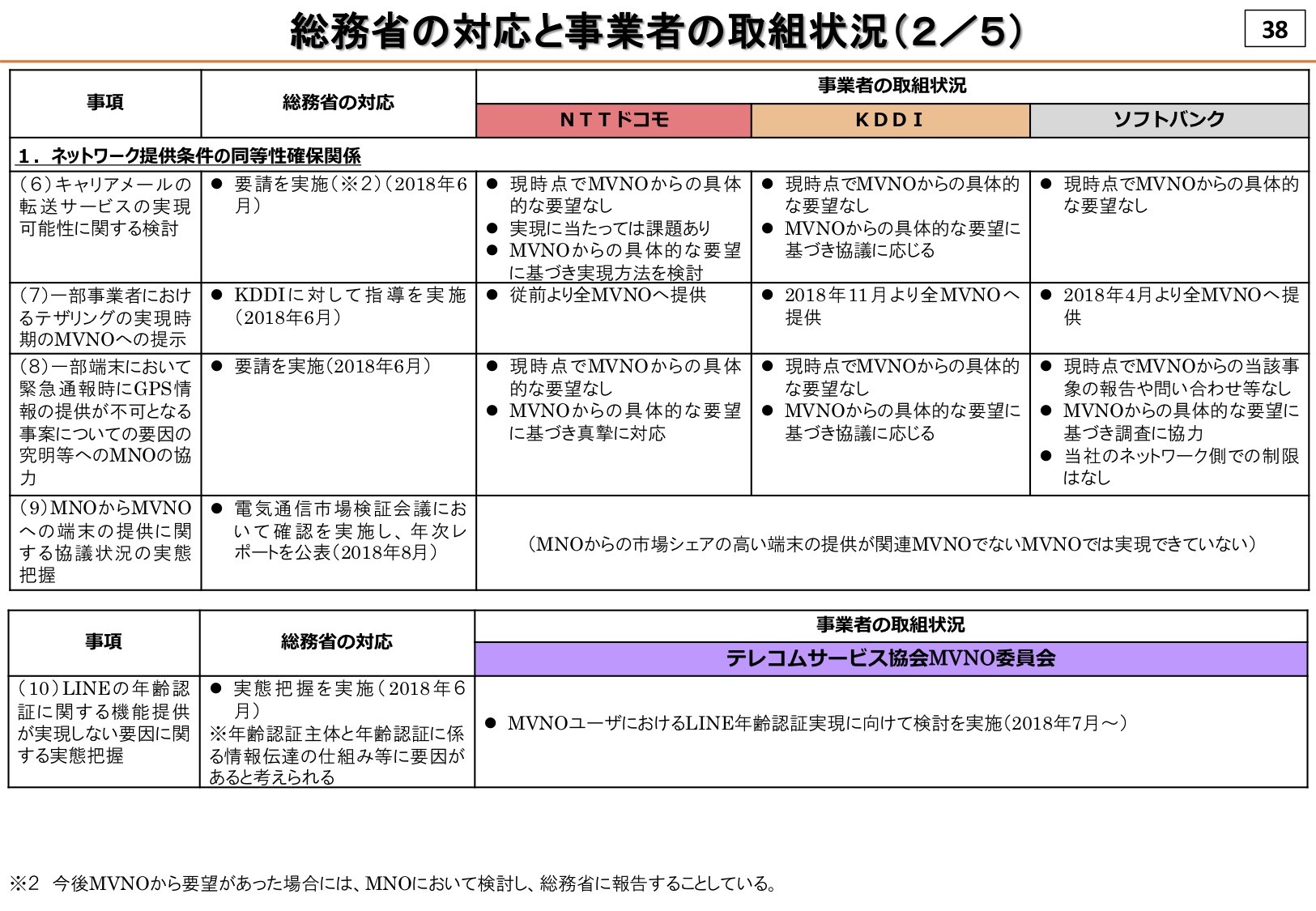指導および要請された項目ではまずすでに実施されているMVNOでテザリングができなかった問題では、個別に紹介もしたようにauでは2018年11月より、ソフトバンクでは2018年4月より提供しているとのこと。なお、NTTドコモでは以前より提供していました。
