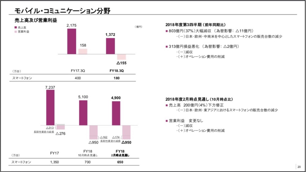同社ではスマホ市場の競争環境がさらに厳しくなるリスクもあることから当初から2018年度における販売台数や業績の下方修正が必要となる可能性があるとしていましたが、まさにそのリスクが顕在化した結果となってしまい、四半期ごとに販売台数および営業収益が下がり、通期見通しも下方修正することになっています。