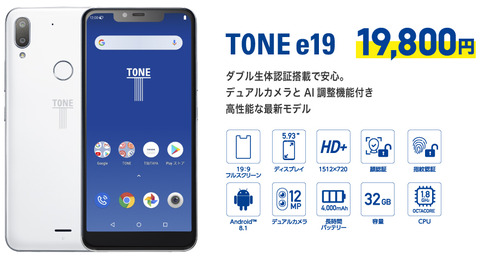 その他、Bluetooth 4.2やGPS、3.5mmイヤホンマイク端子、microUSB端子など。サイズは約153.6×73.1×8.9mm、質量は約167.5g、本体色はホワイトの1色のみ。TONE m17が対応しているワンセグやおサイフケータイ(FeliCa)には非対応となっていることもあり、TONE m17はTONE e19の発売後も併売されるということです。