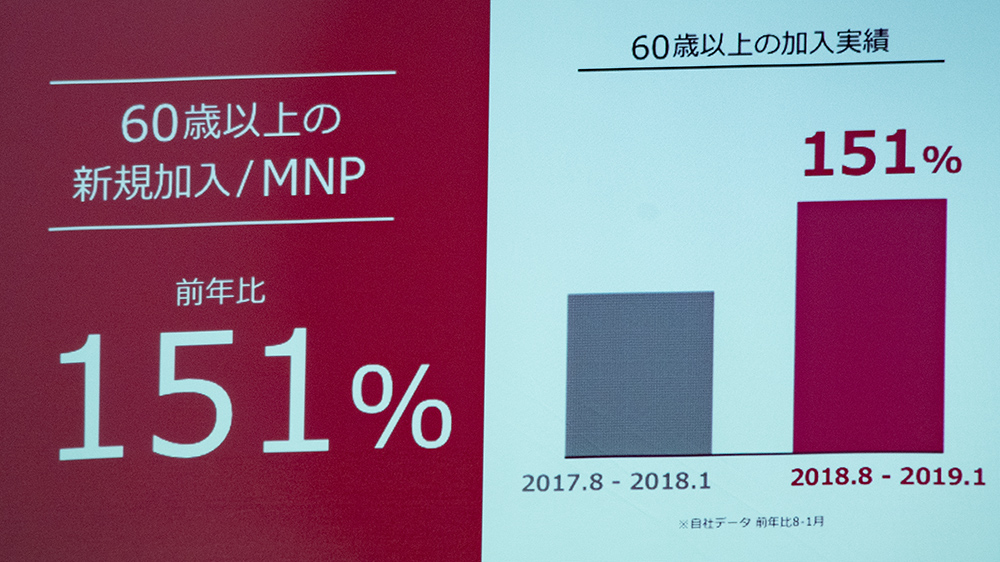 ソフトバンクでは60歳以上の新規加入や他社から乗換(MNP)が増加しており、携帯電話サービス「SoftBank」むけ「シンプルスマホ」シリーズおよびワイモバイルのかんたんスマホといったシニア向けスマホは好調であるという。