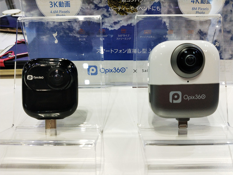 サイホープロパティーズブースには、Lightning接続のiPhone用全天球カメラ「SasuToru i」(サストル アイ)とUSB Type-C接続(変換アダプター使用でmicroUSBでも可)のAndroid端末用全天球カメラ「marut」(マルト)が展示されていました。