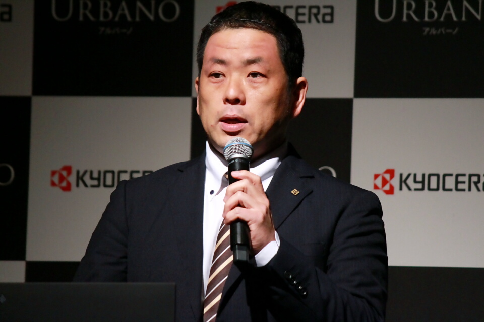 発表会では、京セラ 通信機器事業本部 マーケティング部責任者の湯浅紀生氏も登壇し、URBANO V04の特徴やターゲット層となる「マイルドダンディー」について説明した。そこで、本記事ではURBANO V04を写真や動画で紹介する。