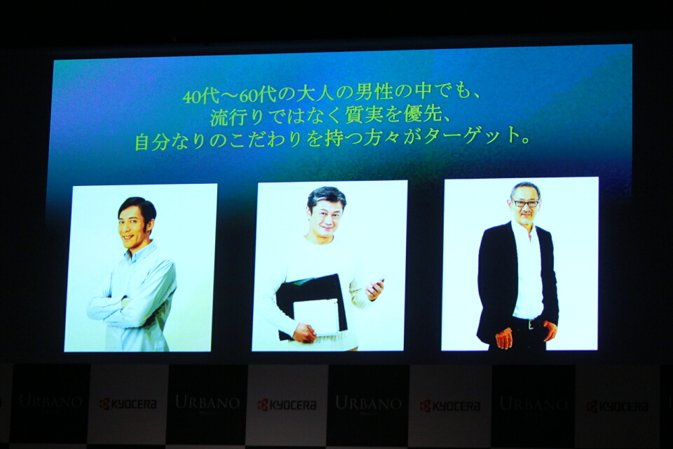 なお、URBANO V04は40代~60代の大人の男性の中でも質実を優先した自分なりのこだわりを持つ人をターゲット層にしているという。