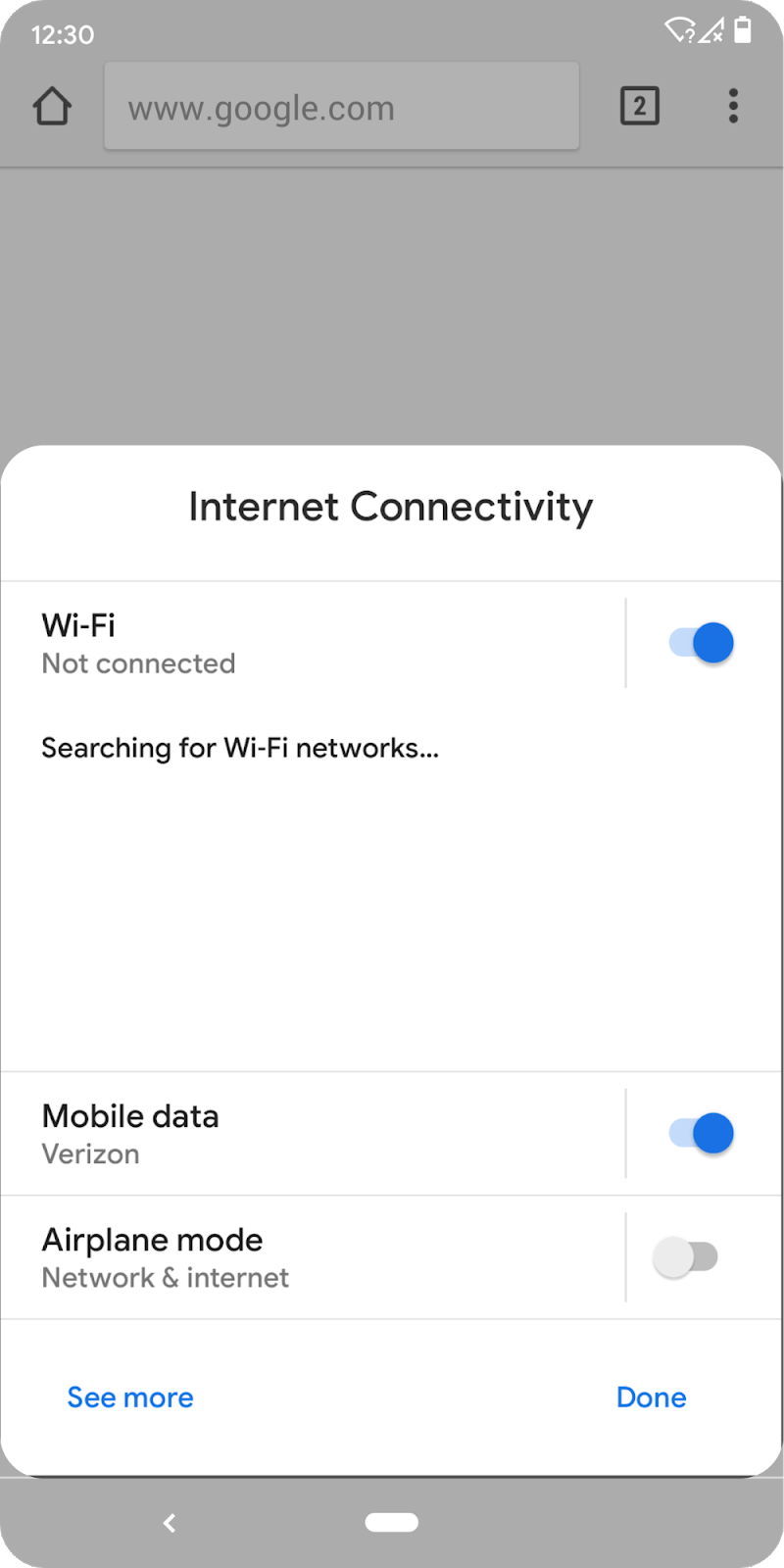 例えば、Webブラウザーでアプリを終了したり、バックグラウンドにしたりする必要はなく機内モードやWi-Fi、モバイルデータなどの接続設定を持つパネルを表示でき、利用者は必要に応じてパネルから設定を変更できるとのこと。設定パネルを表示するには、新しいSettings.Panelアクションの1つを使用してインテントを起動するだけ。