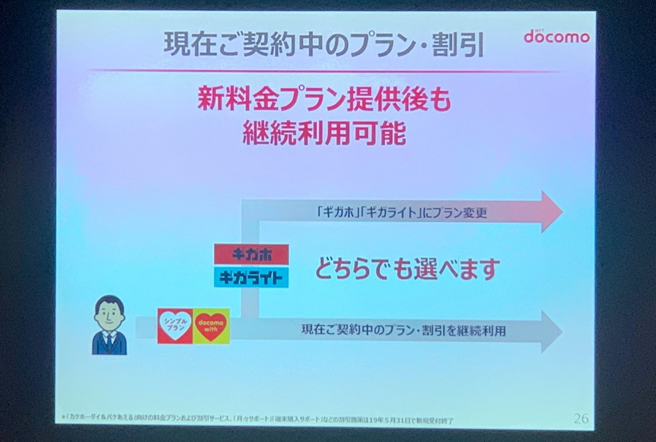 さらに新料金プランの提供開始に伴って既存料金プラン「カケホーダイ&パケあえる」におけるFOMA・Xi向け料金プランおよび「docomo with」などの料金割引サービス、「月々サポート」や「端末購入サポート」などの端末割引サービスは2019年5月31日(金)に、FOMA音声プランおよび割引サービス、iモードは2019年9月30日(月)に、FOMAデータプラン・ユビキタスプランおよび割引サービスは2020年3月31日(火)にそれぞれ新規受付を終了します。ただし、現在契約中の料金プランや割引サービスについては新料金プラン提供後も継続利用は可能とのこと。