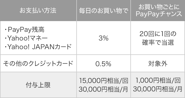 なお、対象の支払方法は変更なくPayPay残高(ボーナス・ライト含む)およびYahoo!マネー、Yahoo! JAPANカードで、その他のクレジットカードは対象外で、PayPayのオンライン決済サービスやAlipayも同様に対象外となっています。