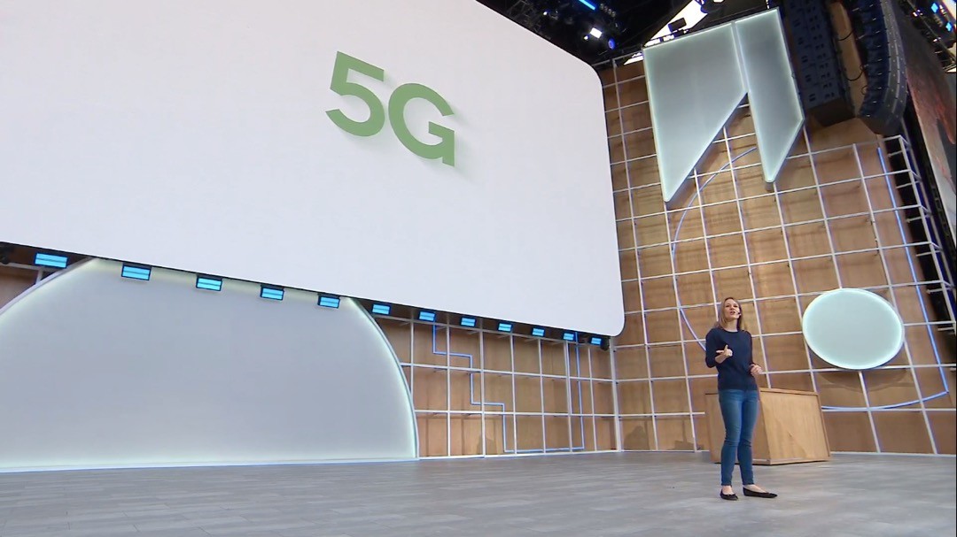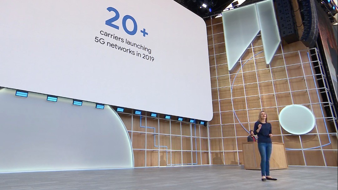 次に携帯電話業界でもう1つの大きな進展は「5G」であることが紹介され、Androidでは5Gを最速でサポートし、直近に世界で20以上の携帯電話会社が5Gネットワークのサービスを開始するとのことで、すでに5Gに対応したAndroid搭載製品が発売されたことを説明。