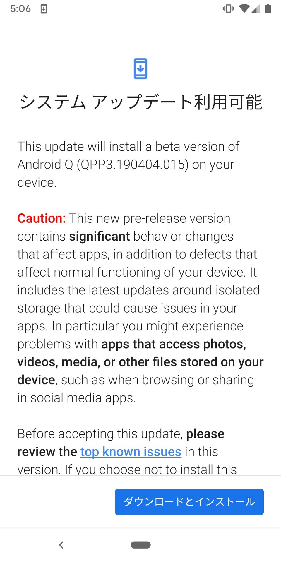 Google I/O 2019に合わせて配信開始されたAndroid Q Beta 3はPixelシリーズではAndroid Beta Program( https://g.co/androidbeta )に登録してネットワーク経由によるソフトウェア更新(OTA)で導入できるほか、パソコン(PC)とUSBケーブルで接続してファクトリーイメージによって導入する方法が用意されており、Pixel 3およびPixel 3 XLなどのPixelシリーズではビルド番号が「QPP3.190404.015」となっています。
