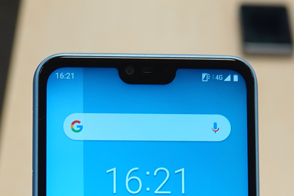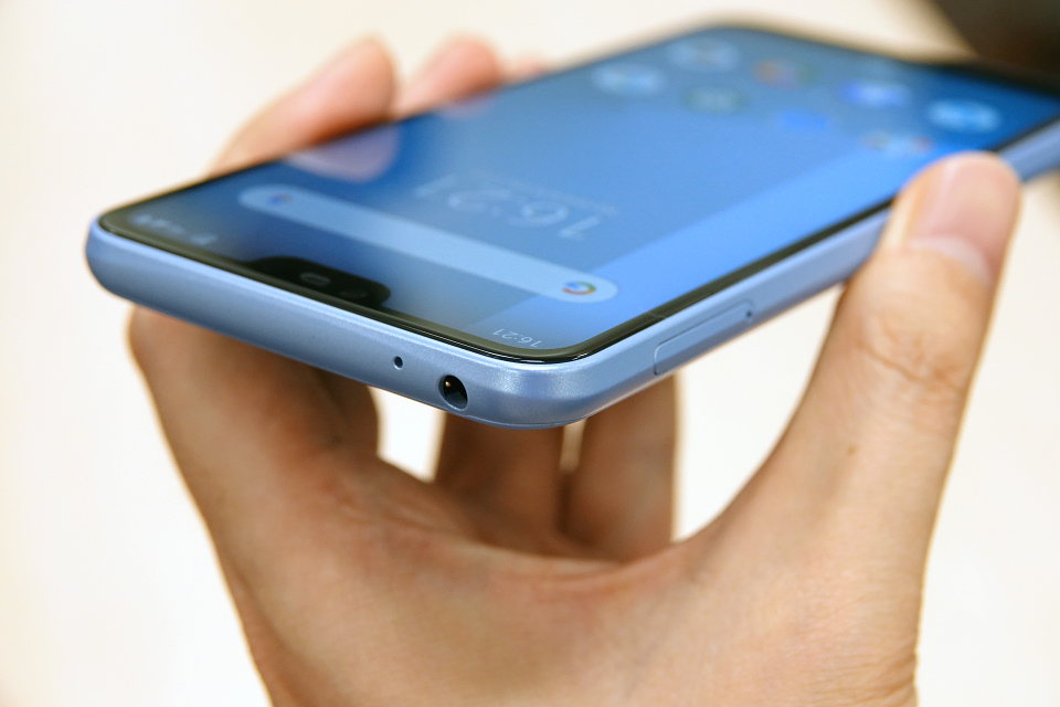 ディスプレイはアスペクト比9:19の約5.8インチFHD+(1080×2280ドット)TFT液晶で、ホームボタンなどは画面内に表示するソフトウェア式のため、画面回りの縁(ベゼル)はそれほど狭くなく画面占有率は高くありませんが、全体としては現在主流の“ほぼ全画面デザイン”となっています。