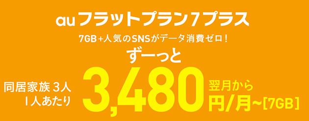| auフラットプラン7プラス | 7GB | 5,480円 | ▲1,000円 | ▲1,000円 | ー | 3,480円 |