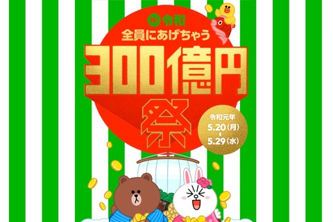 LINEおよびLINE Payは16日、スマートフォン(スマホ)など向け送金・決済サービス「LINE Pay」( https://line.me/pay )において2019年5月20日(月)11:00~5月29日(水)23:59にキャンペーン「祝!令和 全員にあげちゃう300億円祭」( https://linepay.line.me/campaign/30bill.html )を実施すると発表しています。