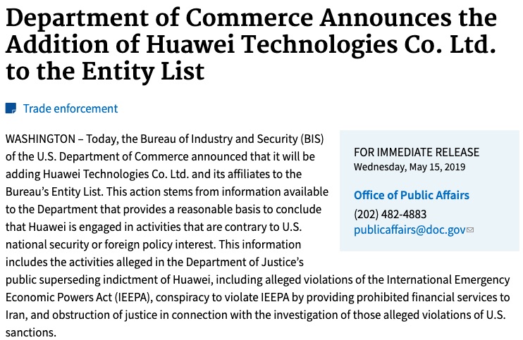 ・Department of Commerce Announces the Addition of Huawei Technologies Co. Ltd. to the Entity List | U.S. Department of Commerce