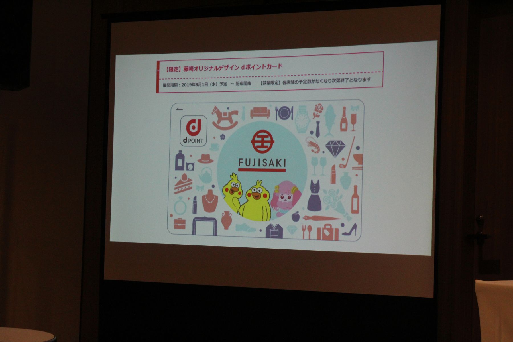 8月1日からは数量限定でオリジナルデザインのdポイントカード配布があります。ポインコ兄弟の隣にいるのは藤崎創業200周年を記念して誕生したキャラクター「ふじドル」です。