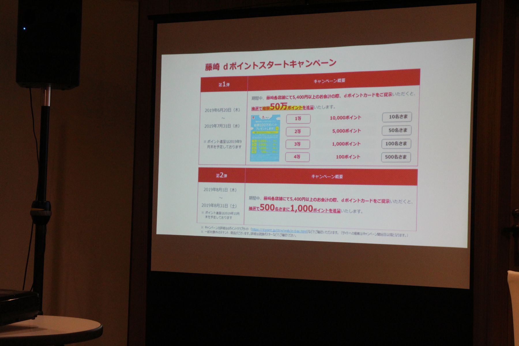 6月17日からのdポイント導入を記念し、6月20日~7月31日まで藤崎各店舗で5,400円(税込)以上の会計の際、dポイントカードを提示しポイントを貯めるまたは使うと、抽選で総額50万ポイントを進呈するキャンペーンが行われます。また、8月1~31日にも藤崎各店舗で5,400円(税込)以上の会計の際、dポイントカードを提示しポイントを貯めるまたは使うと、抽選500名に1,000ポイント進呈というキャンペーンが行われます。