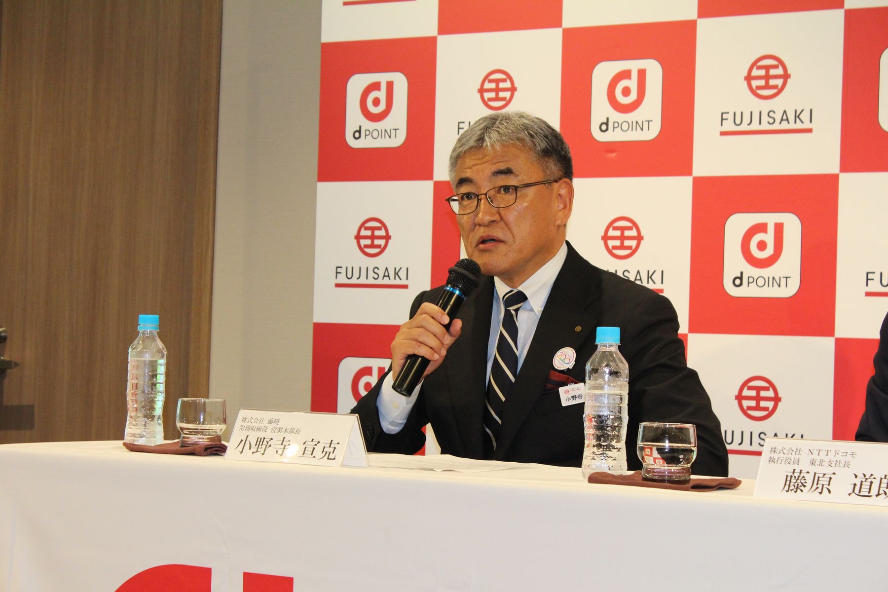 株式会社藤崎常務取締役営業本部長小野寺宣克氏は冒頭の挨拶で「藤崎は創業200周年を迎え、4つのつくる『人をつくる』『商品をつくる』『ネットワークをつくる』『お客様との接点をつくる』をポイントとしています。このうちネットワークは、我々を取り巻く環境の変化が非常に速く、企業様との連携ネットワークを考えたいと思っています。そしてお客様との接点ということで、我々は自社カード『Fカード』で35万人程度の会員がおりますが、今回提携するNTTドコモは東北だけでもその約10倍の会員数を持っています。従来のFカード会員にプラスし、新たな接点を作り、顧客の創造につなげたい」とdポイント導入の意図を語りました。