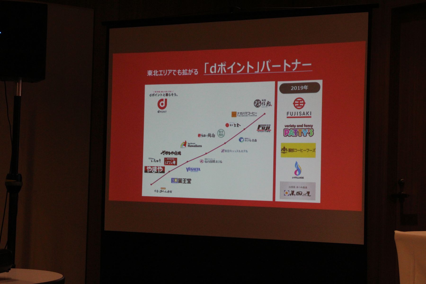 今日藤崎の他、株式会社パティズ、ハットリコーヒーフーズ株式会社、株式会社Jヴィレッジ、株式会社萬国屋を含め、新たに5社と提携を発表し、東北では21社でdポイントが使えるようになりました。