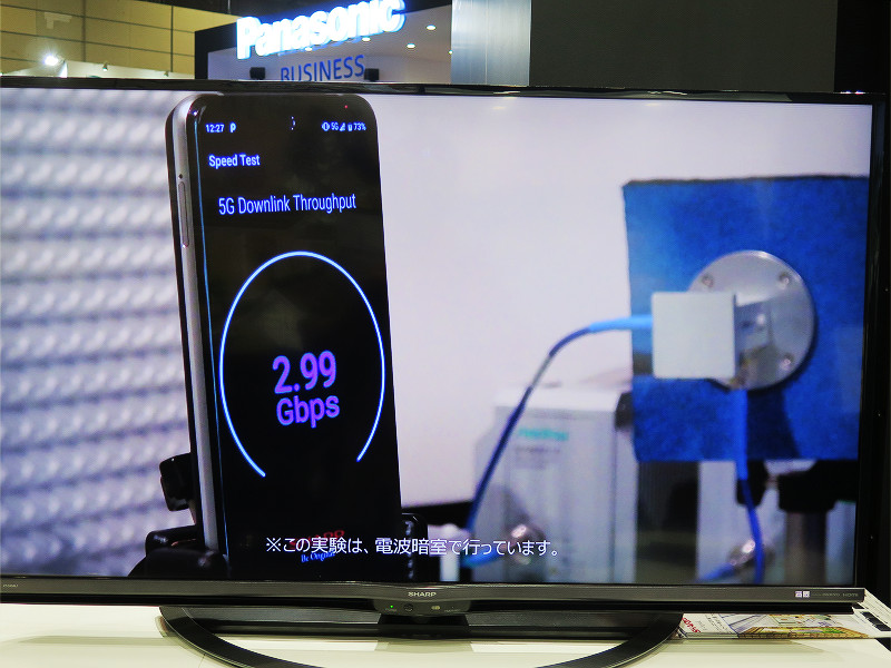 この場での実機によるデモは行われていませんでしたが、電波暗室内での5G接続による通信テストの様子がビデオ展示されていました。
