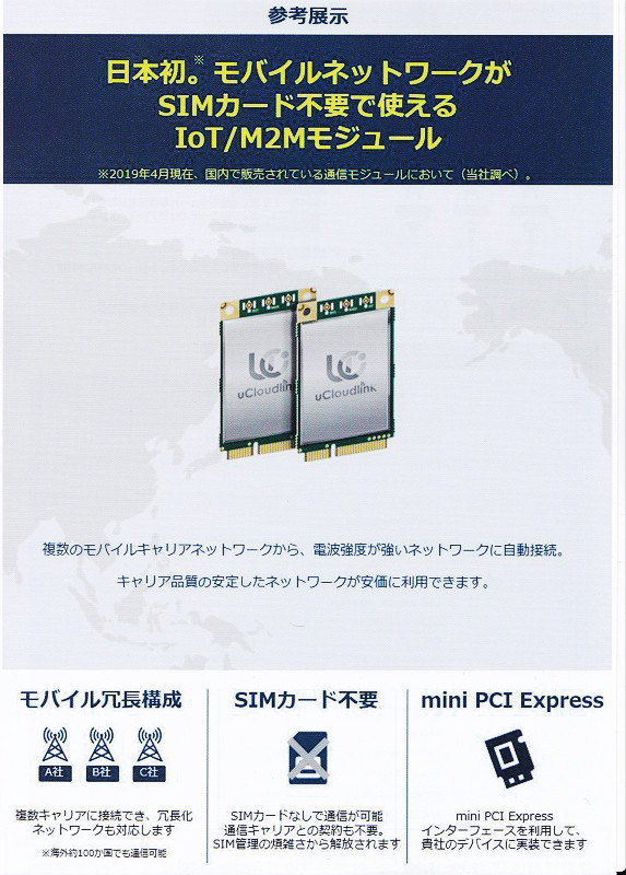 国内にて「FREETEL」ブランドや「jetfon」ブランドのSIMフリースマホなどを展開しているMAYA SYSTEMのブースではノートPC(一部、小型ベアボーンなどのデスクトップPCも含む)などに搭載されているmini PCI Express(miniPCIe)スロットへ接続して利用する「クラウドSIM」(MAYA SYSTEMが提供しているSIMカード不要のネットワーク接続サービス)対応の通信モジュールが展示されていました。