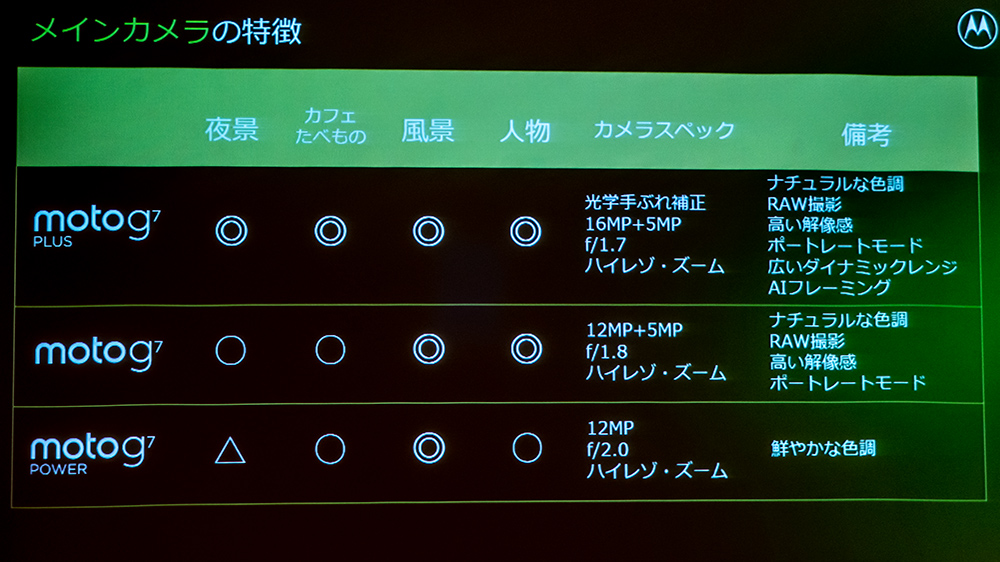 3モデルの主な違いは、バッテリーとカメラ、ディスプレイとなっており、moto g7 plusは光学式手ブレ補正付きの約1600万画素イメージセンサーと約500万画素イメージセンサーによるデュアルリアカメラ、ディスプレイは6.24インチFHD+(1080×2270ドット)IPS液晶、バッテリーは3,000mAhとなる。