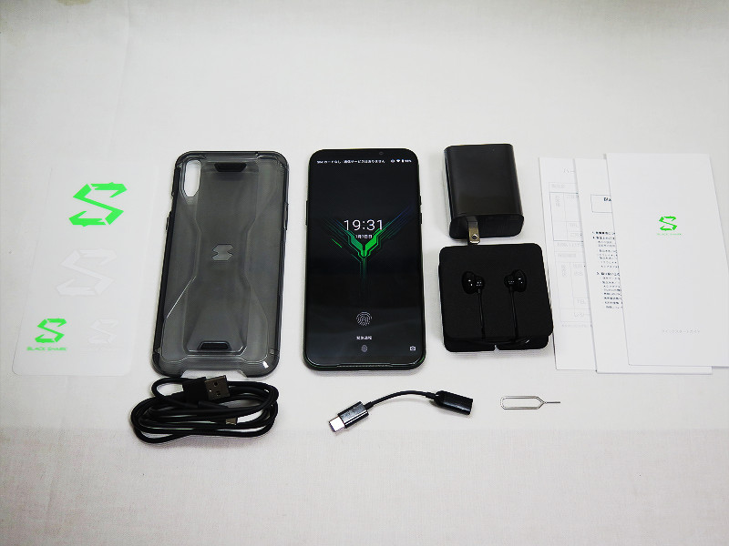 個装箱にはBlack Shark 2本体のほか、USB充電器やUSB Type-Cケーブル、クリアカバー(スモーク)、USB Type-C接続のステレオイヤホン、Black Sharkオリジナルステッカー、マニュアル類(スタートガイドや保証書など)が入っています。