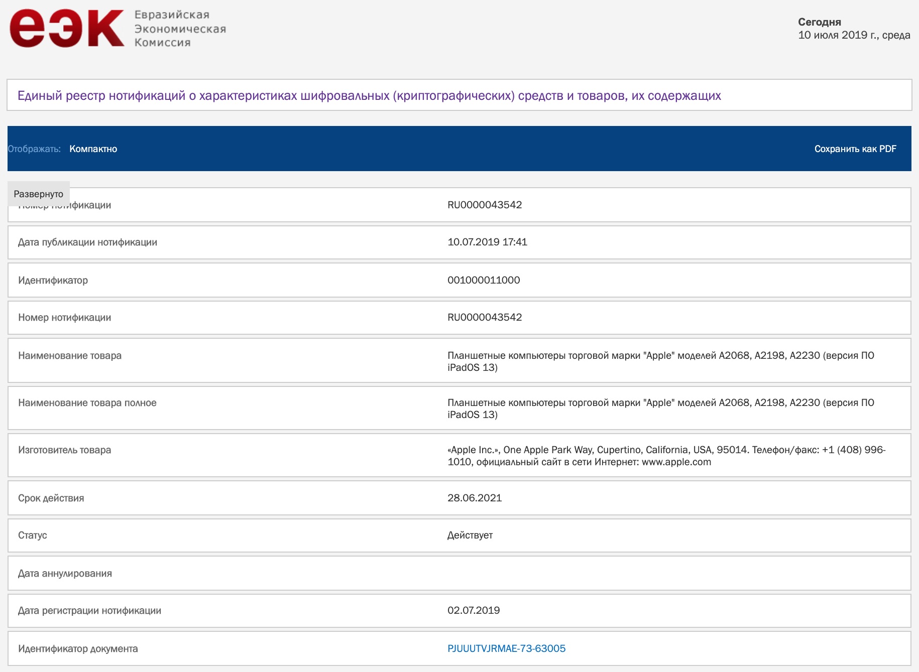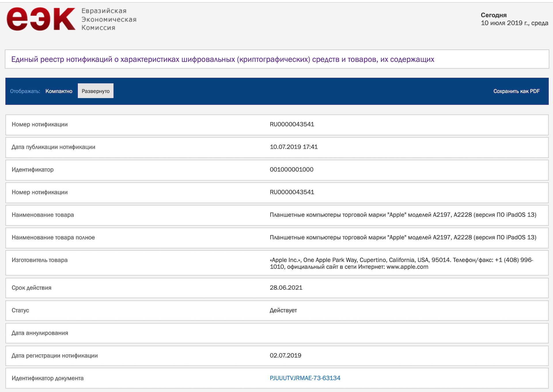 ロシアやカザフスタン、ベラルーシなどのユーラシア経済連合の管理組織であるユーラシア経済委員会(Eurasian Economic Commission;EEC)は10日(現地時間)、Apple製タブレット「iPad」シリーズにおける未発表の型番「A2197」および「A2228」(Notification number: RU0000043541)と「A2068」および「A2198」、「A2230」(Notification number: RU0000043542)が認証を取得したことを公開しています。