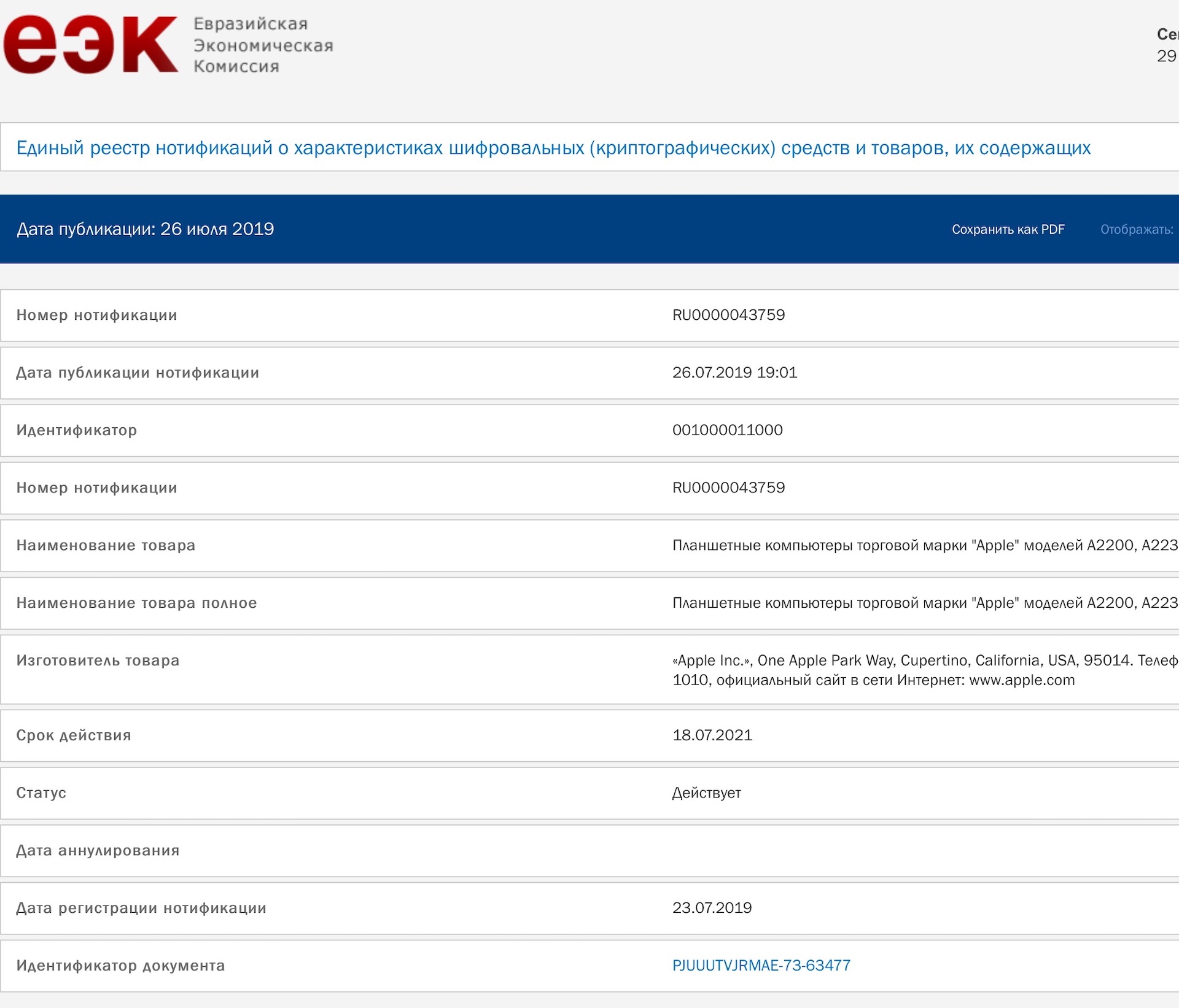 ロシアやカザフスタン、ベラルーシなどのユーラシア経済連合の管理組織であるユーラシア経済委員会(Eurasian Economic Commission;EEC)は26日(現地時間)、Apple製タブレット「iPad」シリーズにおける未発表の型番「A2200」および「A2232」(Notification number: RU0000043759)が認証を取得したことを公開しています。