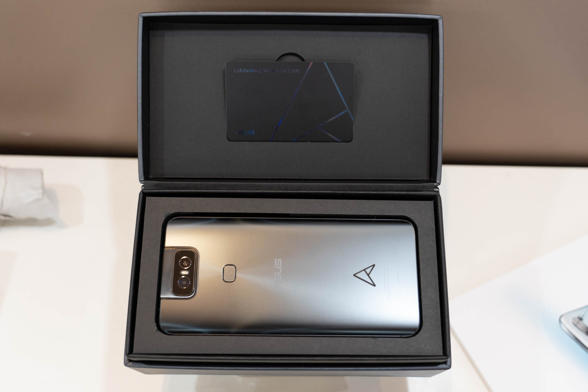 そしてこちらがASUSTeK Computerの30周年記念特別仕様モデルのZenFone 6 Edition 30で、通常モデルよりも価格が高く設定されていますが、仕様としても12GB RAM・512GBストレージと通常モデルよりも強化されており、スペックだけでなく外観も30周年記念モデルだけのものになっています。